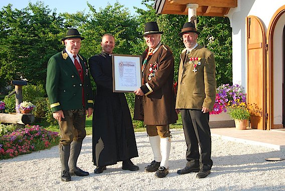 Auf Initiative von Schützenkurat Militärpfarrer Mjr. Richard Weyringer versammeln sich Landesfahne, Bezirksfahnen und Fahnenabordnungen der Salzburger Schützenkompanien zur Maiandacht in Bad Dürrnberg